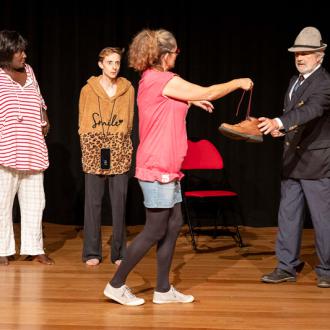 Le groupe se retrouve une fois par mois pour un travail progressif sur la technique théatrale et avec l'objectif d'un spectacle de sketches et saynètes en première partie des représentations de fin d'année de la troupe. Ce stage permet une expérimentation du théâtre et de la scène.